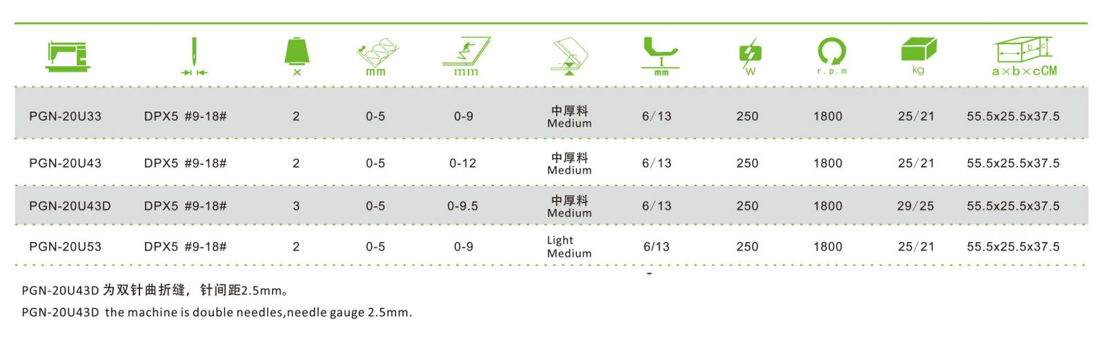 PGN-20U43D and PGN-20U23D, the machine is double needles,needle gauge 2.5mm.