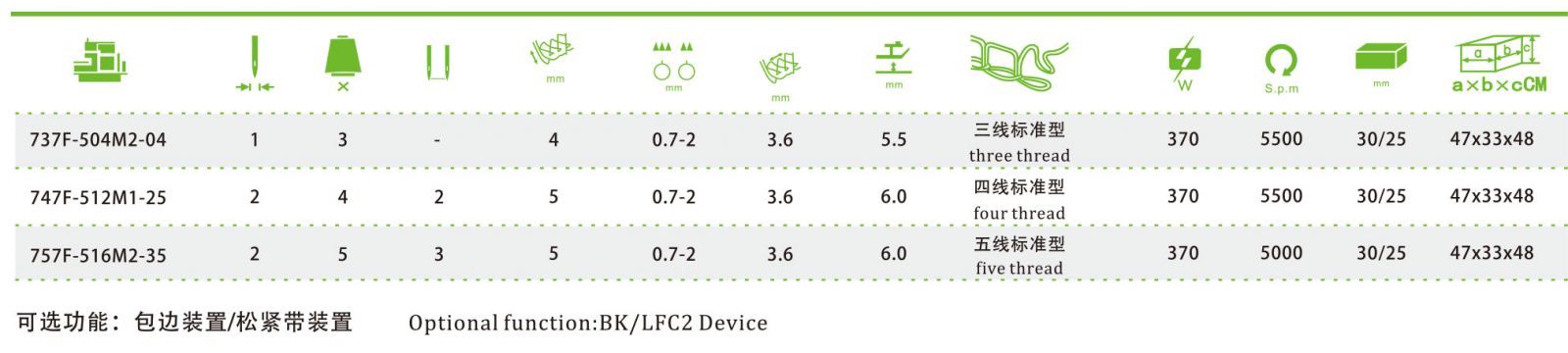 Applicable to the over edging operation of thin lubricating device, the machine operates perfectly and smoothly at low sewing tension, and perfect stable stitches even at high speed.